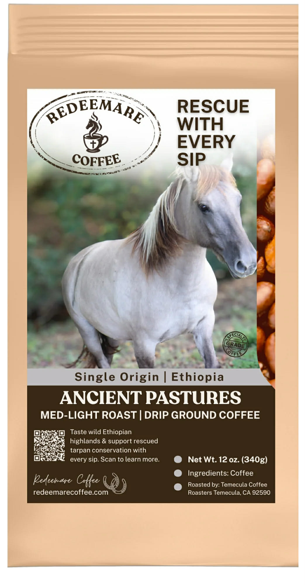 Breaking News! We just learned that Magic has added Advertising to his resume! He is representing the Ancient Pastures Ethiopian coffee roasted by Redeemare Coffee based in Temecula CA. The blend is a light-roasted coffee with hints of caramel, vanilla, floral automatics, and wild berry undertones. Magic was specifically chosen to represent this blend because Tarpan horses are a living testament to the power of returning to roots, to honoring the authentic essence of a thing. The Ancient Pastures Ethiopian coffee is the same - the genetic and spiritual ancestor of almost all coffee cultivated today.